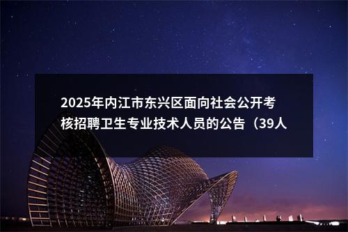 此次公开考核招聘事业单位工作人员39名。具体岗位、招聘名额等详见《2025年内江市东兴区面向社会公开考核招聘卫生专业技术人员岗位一览表》(附件1)。